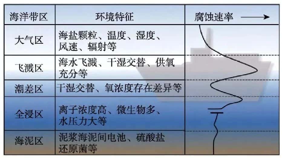 根据舰船结构、设备和装置的暴露条件,舰船用金属材料所处海洋腐蚀环境从上到下可分为5个区带:海洋大气区、浪花飞溅区、海水潮差区、海水全浸区和海底泥土区,且不同区带具有不同的环境特征,如图1所示。