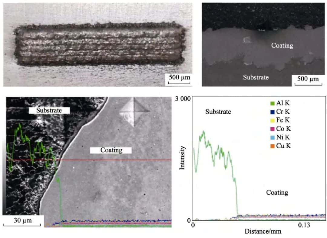 金属涂镀层通常通过电镀、热浸镀、热喷涂、激光熔覆等方法制备,使被保护金属表面形成另一种金属的保护涂镀层。金属涂镀层通常选用锌、铝等较为活泼的金属材料,通过牺牲表面涂镀层起到保护基材的作用,已广泛应用于舰船用金属材料的腐蚀防护上。此外,还可以选择涂镀高耐蚀和耐磨性的材料,例镍、铬、高熵合金等。有研究人员利用高能激光熔覆工艺在铝合金表面制备了AlxCrFeCoNiCu高熵合金涂层,如图2所示,明显提升了材料的耐腐蚀和耐磨性能。