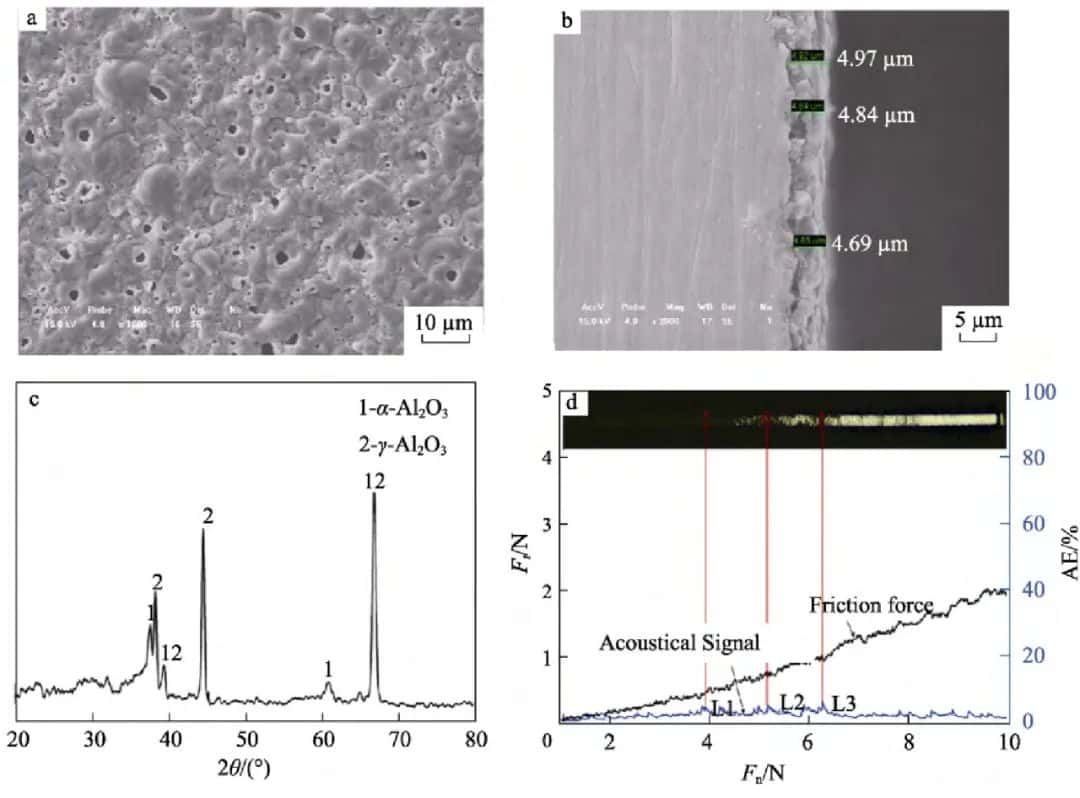 无机涂层包括搪瓷涂层、陶瓷涂层、硅酸盐水泥涂层、化学转化膜等,主要通过热喷涂、直接涂覆、气相沉积、阳极氧化等工艺制备。其中,微弧氧化工艺是常用的一种直接在金属表面原位生长陶瓷层的电化学方法,获得的氧化物薄膜通常具有耐腐蚀、耐高温和耐磨等优异性能,广泛应用于铝合金、钛合金等轻金属的腐蚀防护。有研究人员利用微弧氧化在7075铝合金表面制备了腐蚀防护涂层,如图3所示,可见形成的氧化铝涂层与基体结合良好,并显著降低了7075铝合金在模拟海水溶液中的腐蚀速率。